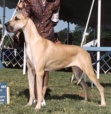 | Belle finished her championship quickly. Bred to Buck (Tytus' grandson and Taylor's littermate), her first litter included Ch Marlena, Lakota CDX, Ch Truman, Maya CD, and Ch Ellen. Her second litter , sired by Tytus, consisted of two girls, Ch Margaret and Marilyn.. Belle's mother is Ch McEmn's Eleanor Riggsbee and her sire is Ch OurDane's Fabulous Fabio and her littermate is Ch McM Anj Eleanor's Roosevelt. Belle is OFA hips good. |
